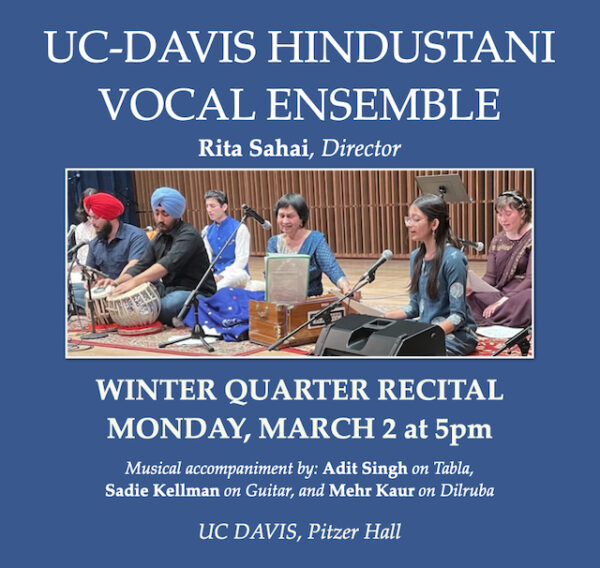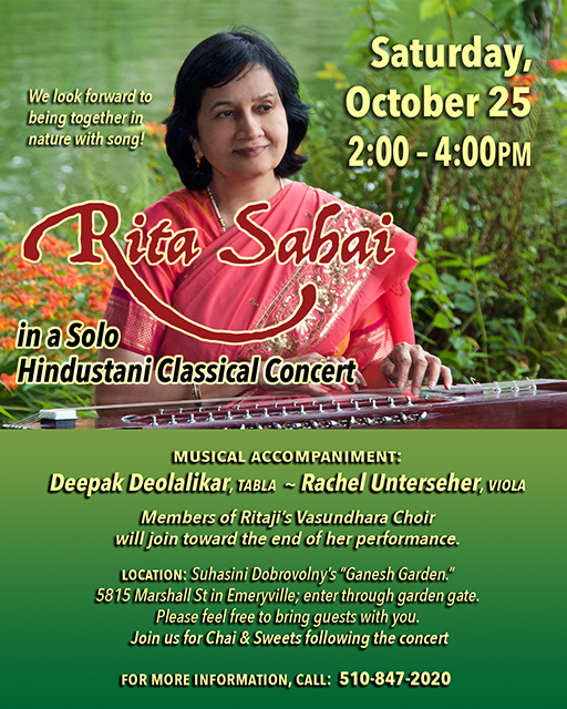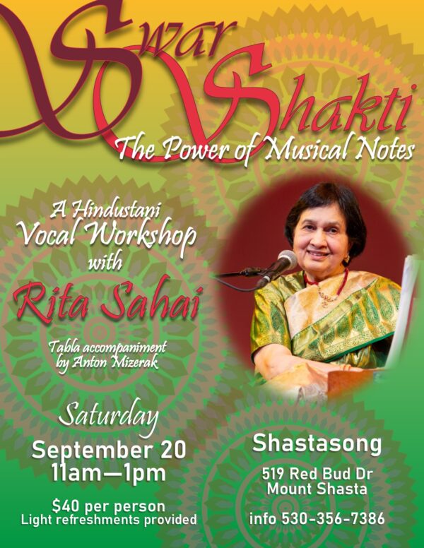 Following Ritaji’s Concert in Mount Shasta, she will offer a Hindustani Vocal Workshop at Shastasong Events Studio on Saturday, Sept. 20th.